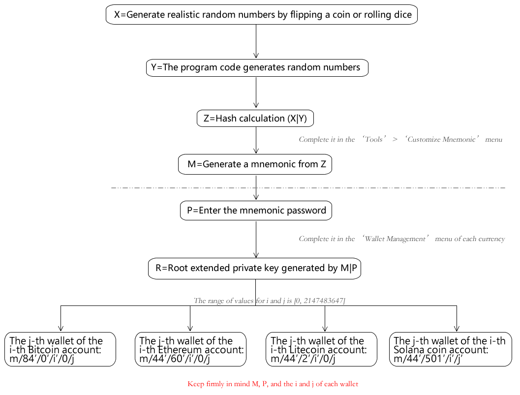 First, refer to the following diagram to generate a mnemonic phrase, protect the mnemonic phrase with a password, and use an HD wallet uniformly.